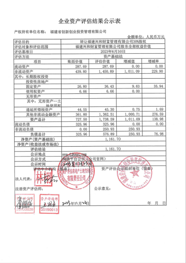 我公司擬將持有的福建興和財(cái)富管理有限公司30%股權(quán)通過公開交易的方式對(duì)外掛牌轉(zhuǎn)讓,現(xiàn)將資產(chǎn)評(píng)估結(jié)果予以公示,公示期為五個(gè)工作日,公示電話:0591-87857035,地址:福州市軟件大道89號(hào)華興創(chuàng)業(yè)中心。